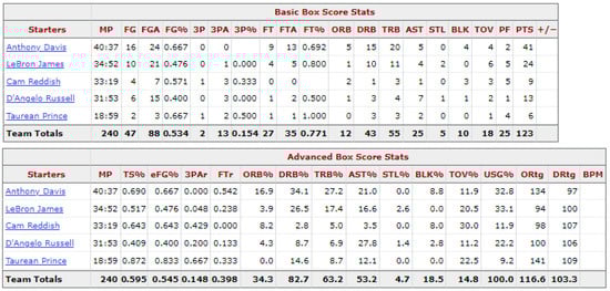 Basketball statistics are quite different from other sports, as it is considered a fast-paced sport in the sense that the score fluctuates a lot during the game, and it turns out to be crucial to analyze all the metrics available during the game. Figure 4 shows a standard box score of an NBA game, where 33 metrics will be considered from this website.