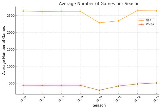 For the WNBA, we can see that there are more than 400 games per season, but in one of the seasons, 2020, there are substantially fewer games. Similarly in the NBA, COVID-19 has also affected this league and preventive measures were taken to reduce the number of games. We draw attention to the 2022 and 2023 seasons, when there was a significant increase in games due to the Commissionary Cup, which introduced a tournament within the league that resulted in a greater number of games in those seasons.
