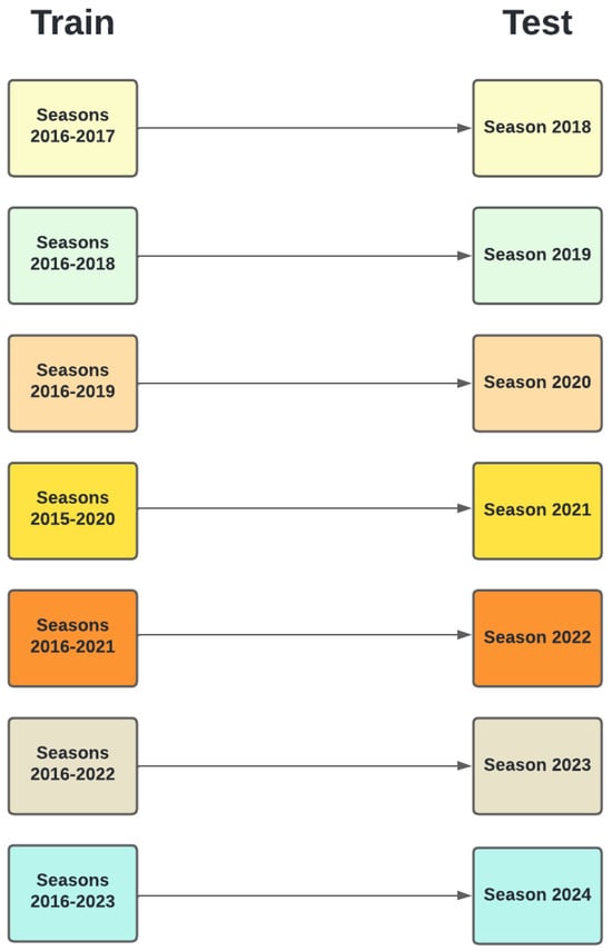 The way in which the training and test data are divided is also very important. In this study, a different approach was tried: dividing the dataset by seasons and using the seasons before the one being tested for training. The approach taken by previous work involves dividing the dataset into a training set and a testing set. This allows a portion of a season to be utilized for testing within the training set, potentially leading to improved results as training incorporates patterns specific to that season.
