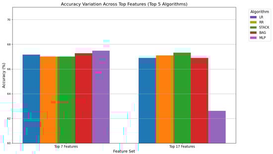 Figure 18 shows the results of the MLP algorithm with the Top 7 Features in each WNBA season studied. It is possible to see a sharp decrease in the 2020 season at the same time that COVID-19 decelerated. As in the NBA, there have been several changes at all levels in the WNBA that are responsible for this percentage decrease. In the 2020 season, the number of games in the regular season was reduced from 36 games to 22, which means that there is less information. That season was also played in a “bubble” at the IMG Academy in Bradenton, Florida to minimize the risk of contagion, very similar to what happened in the NBA. The “home_next” feature is one of the most important features of the feature selector algorithm, and the fact that there is no crowd and all games are played on a neutral field means that one of the most important features no longer has an influence. Some players also did not participate due to health concerns, which means that the information provided may be less concise than this season.