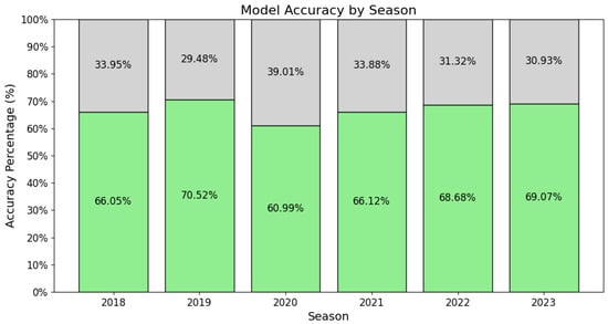 Table 13 shows the results with the 2020 season removed from the training set to understand the impact that this season, which was severely affected by the pandemic, had on the algorithm predictions. There were some increases, especially in the RR algorithm, which reached 69.59% and was previously at 68.81%.