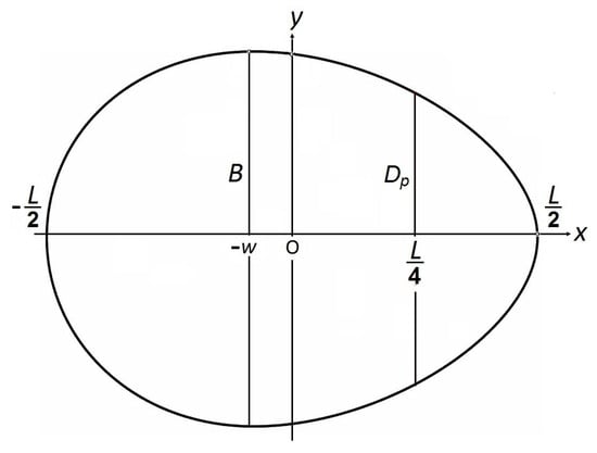 That is, to derive the formula for computing the R value, it is necessary to proceed from the mathematical dependence y = f(x) describing the geometry of the egg profile. Recent studies in this area [26,27] have demonstrated that an egg of any shape can be extremely accurately described mathematically using the following geometric parameters: maximum breadth (B), egg length (L), the distance (w) by which the maximum breadth of the egg is shifted from its center, i.e., from the point x = L/2, and the egg diameter (Dp) at a point located at a distance of L/4 from its pointed end (Figure 1).