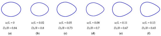 In the example of egg contours (Figure 3), we did not present all the intermediate variants, limiting ourselves to the main ones that demonstrate some stages of shape modification. The images in Figure 3a,f display the boundary variants of egg profiles. That is, say, an even greater increase in the value of w/L and/or a decrease in Dp/B will lead to the creation of virtual eggs that cannot be found in real-world conditions.