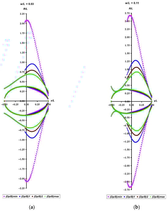 Visualization of the R/L graphical dependences for egg categories with B/L = 0.75 and w/L = 0.03 (a) and w/L = 0.11 (b). The conicity index symbols correspond to the following values: (Dp/B)min = 0.70, (Dp/B)1 = 0.76, (Dp/B)2 = 0.80, (Dp/B)max = 0.84 (a); and (Dp/B)min = 0.65, (Dp/B)1 = 0.70, (Dp/B)2 = 0.74, (Dp/B)max = 0.77 (b). The values (Dp/B)min and (Dp/B)max conform to the rounded values obtained as a result of calculation using Formulae (11) and (12). The values (Dp/B)1 and (Dp/B)2 are approximately equidistant from (Dp/B)min and (Dp/B)max. For convenience, the color characteristics of the egg profiles and the corresponding R/L functions coincide.