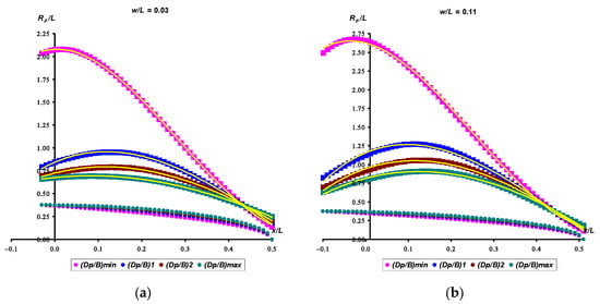 To find the coordinates of the extremum of the function Rp/L (Equation (14)), we need to find its derivative and equate it to zero. However, it is difficult to do this due to complex mathematical transformations and calculations. In this regard, we decided to use approximate methods. For this, it is advisable to approximate the obtained Rp/L dependencies with a suitable polynomial equation, the mathematical analysis of which is more convenient than the cumbersome Equation (14). The derivative of such a polynomial, equated to zero, will give the horizontal coordinate of the extremum point (x/L)ext. Substituting this value into Equation (14) will allow us to determine the coordinate of the extremum point along the vertical axis (Rp/L)ext that, in our case, will correspond to the maximum possible value of the function Rp/L (Equation (14)).