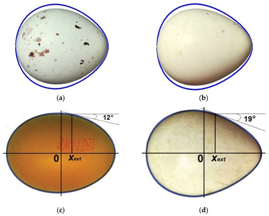 The maximum absolute value of the angle α (23.7°) seems to be large enough that the egg contours that demonstrated such high values were subjected to a more detailed analysis. As a result, it was noted that high values of α are inherent in almost spherical eggs with a clearly defined conical pointed end (Figure 6a,b). For example, the index values of the generated virtual egg contours were: B/L = 0.9, w/L = 0.06, Dp/B = 0.76 (Figure 6a, blue contour), and B/L = 0.88, w/L = 0.09, Dp/B = 0.73 (Figure 6b, blue contour). For both contours, the absolute value of α was 23.7°.