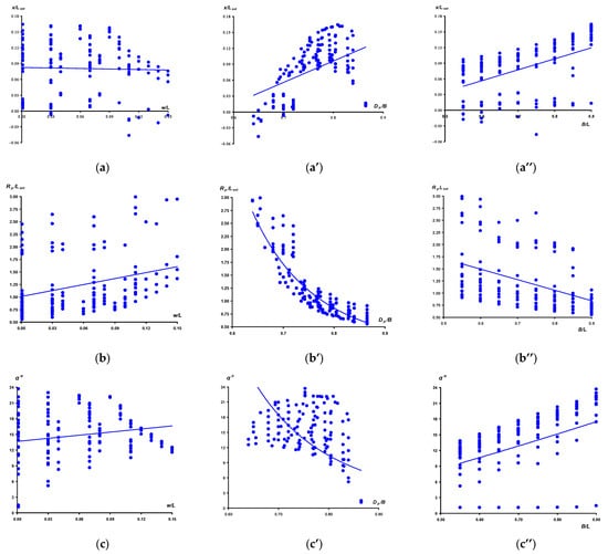 Visualization of correlation links between, respectively, (x/L)ext (a,a’,a’’), (Rp/L)ext (b,b’,b’’) and α (c,c’,c’’) and the corresponding egg indices w/L (a,b,c), Dp/B (a’,b’,c’) and B/L (a’’,b’’,c’’).