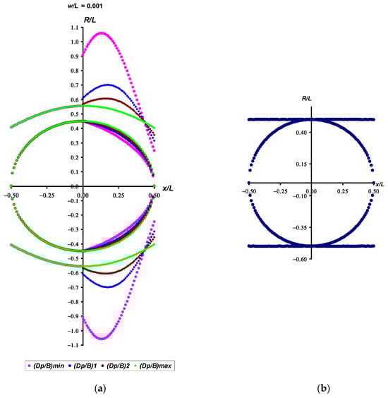 Visualization of the R/L graphical dependences for egg categories with B/L = 0.9 and w/L = 0.001 (a). The conicity index symbols correspond to the following values: (Dp/B)min = 0.753, (Dp/B)1 = 0.809, (Dp/B)2 = 0.837, (Dp/B)max = 0.865. The values (Dp/B)min and (Dp/B)max conform to the rounded values obtained as a result of calculation using Formulae (11) and (12). The values (Dp/B)1 and (Dp/B)2 are approximately equidistant from (Dp/B)min and (Dp/B)max. For convenience, the color characteristics of the egg profiles and the corresponding R/L functions are the same. (b) The R/L curvature radii for a circle.
