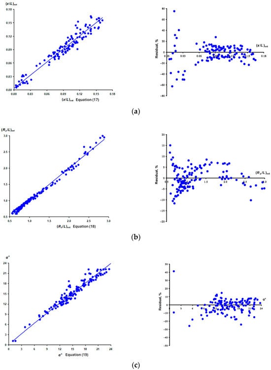 Visualization of statistical characteristics of computation accuracy (scatter plots plus fitted line plots and residual plots) for (x/L)ext (a), (Rp/L)ext (b) and α° (c) using the derived approximation models (Equations (17)–(19), respectively).