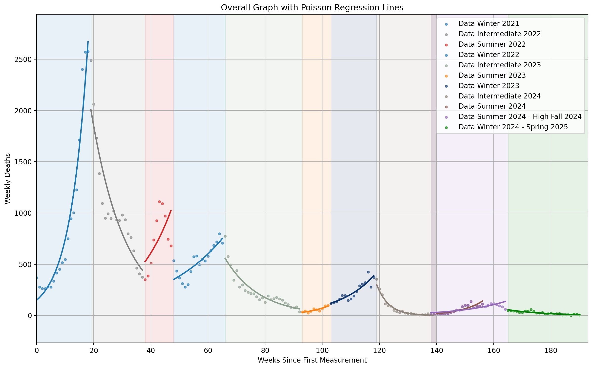 | Seasonal Segment | Deaths | MAE (Linear) | MAE (Poisson) | Percentage Error MAE (Linear) | Percentage Error MAE (Poisson) | RMSE (Linear) | RMSE (Poisson) |