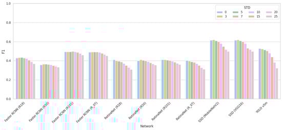 Figure 3. F1 values for noise-free image (STD = 0) and noisy images with seven values of STD for eleven types of CNNs.