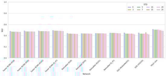 IoU values for three values of STD are presented in Figure 12. Their analysis shows the following. First, for most CNNs, IoU values are smaller than those ones in Figure 8b, Figure 9b and Figure 10b. This means that small-sized objects are localized with worse accuracy than objects of arbitrary size in general. Quite bad results are obtained for Faster R-CNN family and YOLOv5m. The best results are achieved for RetinaNet (ResNetXt) CNN. Second, more intensive noise leads to smaller IoU for practically all networks. Third, the use of the BM3D filter is almost always useless (except YOLOv5m, although its performance for small-sized objects is poor). Meanwhile, the use of preprocessing by DRUNet can be helpful for SSD networks.