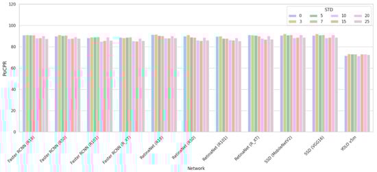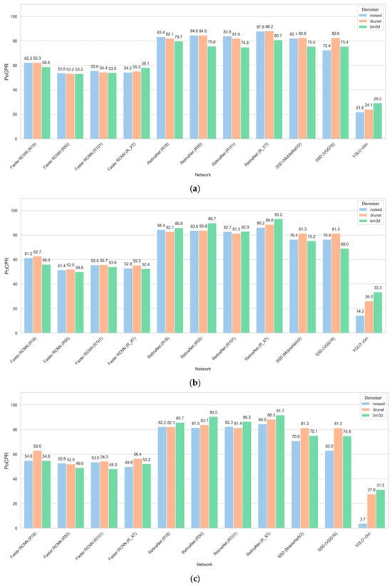 Finally, Figure 13 presents the PoCPR data for three considered STDs. A comparison with the corresponding data in Figure 8c, Figure 9c and Figure 10c shows that there are CNNs for which PoCPR for small-sized objects is significantly smaller than for objects in general—these are, e.g., Faster R-CNN family and YOLOv5m networks. The results for other CNN families are better. For original images, PoCPR decreases if noise intensity increases. The use of pre-filtering occurs expedient, especially for intensive noise. For some networks, the BM3D filter performs better whilst, for other networks, the situation is the opposite.