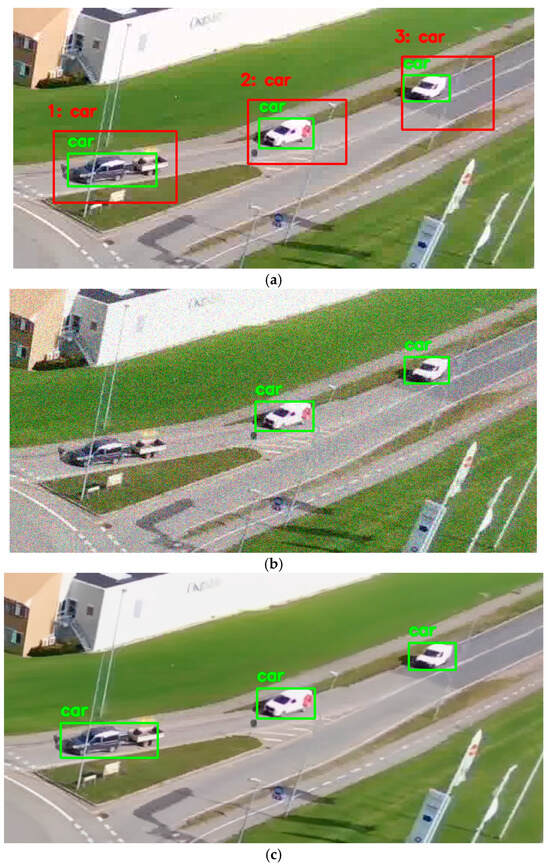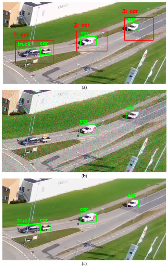 Figure 7 shows the image processing results for another CNN, YOLOv5m. Again, green rectangles are considerably smaller than the corresponding red ones and this influences IoU. In this case, the leftmost object marked as “car” is classified as two objects (“truck” and “car”, see Figure 7a,c). Due to intensive noise, the leftmost object is not correctly detected (Figure 7b).