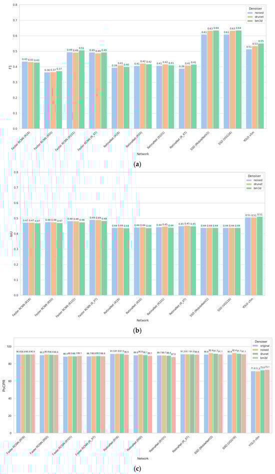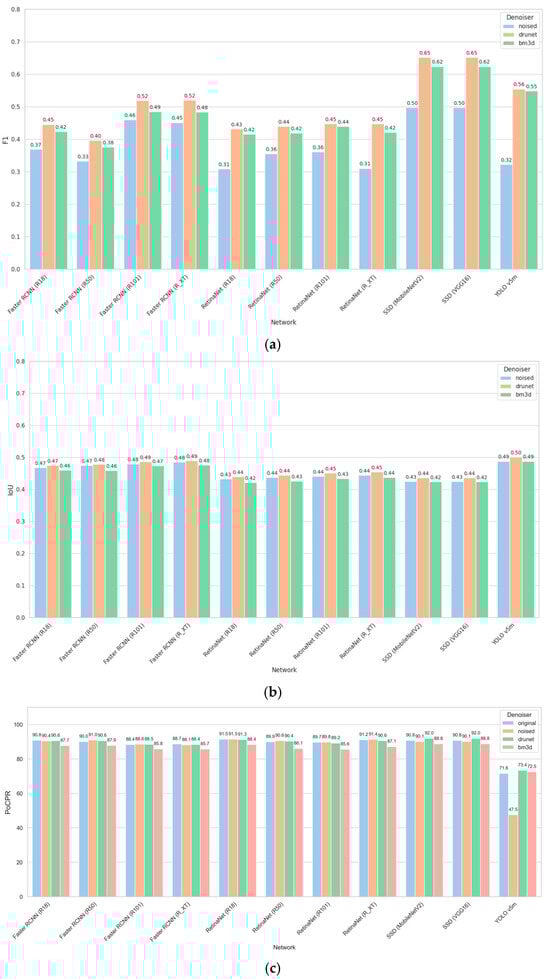The results obtained for STD = 15 are presented in Figure 9. There are obvious improvements of F1 (Figure 9a), especially for Faster RCNN (ResNet50), SSD, and YOLOv5m when the DRUNet filter is applied. The results for the BM3D filter are usually worse than for the DRUNet filter, although performance improvement due to filtering is observed for almost all considered CNNs.