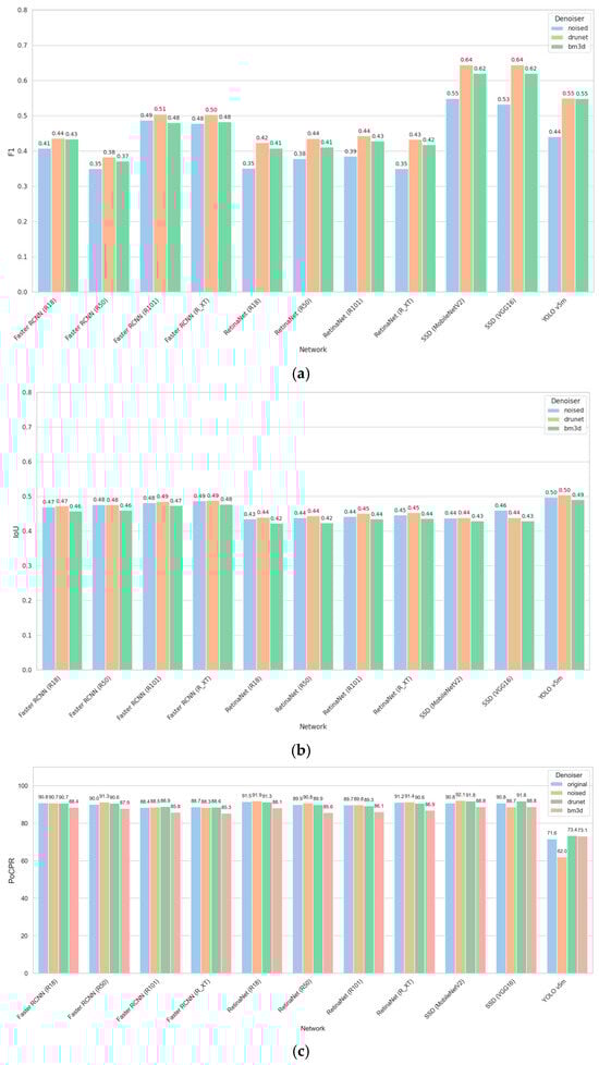 Figure 8 shows the results for STD = 5. There are minor improvements due to filtering for ResNet50 and ResNetXt backbones for CNNs according to F1 metric for BM3D filter (see the data in Figure 8a), but there can not be small performance reduction due to filtering according to other metrics (see data in Figure 8b,c). So, we can state that for STD = 5 the filtering is practically useless in the sense of object localization and classification.