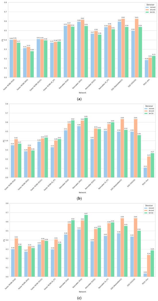 Figure 11. F1 for small-sized objects for STD = 5 (a), STD = 15 (b), and STD = 25 (c).