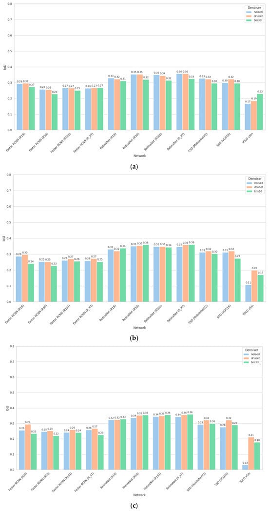 Figure 12. IoU for small-sized objects for STD = 5 (a), STD = 15 (b), and STD = 25 (c).