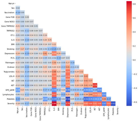 The strongest correlations with the target variable Severity were observed for IL-6 (0.838), Depression (0.739), LDL-H (0.663), AST (0.663), Platelets (−0.628), Lymphocytes (0.627), and ALT (0.612). These findings highlight the relevance of inflammatory markers (IL-6), mental health status (depression), lipid profile (LDL-H, triglycerides), liver enzymes (AST, ALT), and haematological parameters (lymphocytes, platelets) in shaping the severity of COVID-19.