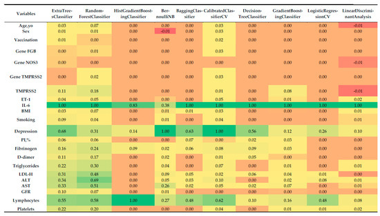 Negative feature importance. Some models, such as BernoulliNB (Sex: −0.0098) and Linear Discriminant Analysis (Age, yo: −0.0077, TMPRSS2: −0.0077), demonstrated negative feature importance for certain variables. This phenomenon may indicate that shuffling these predictors slightly improves model performance, which is uncommon and may be related to noise in the dataset or the weak contribution of these variables.