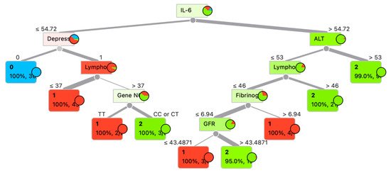 Figure 4 presents a decision tree constructed to predict the probability of COVID-19 outcomes. The primary predictor at the root node is the interleukin-6 (IL-6) level. Subsequent branching is determined by clinical and biochemical parameters such as alanine aminotransferase (ALT), lymphocyte count (Lympho), depressive status (Depress), fibrinogen concentration, glomerular filtration rate (GFR), and the genetic marker (Gene N). Each node of the tree displays the splitting condition, the target class (0—mild course disease, 1—moderate severity course disease, 2—severe disease) (Table 1), probability, and the number of samples within the node. For example, when IL-6 ≤ 54.72 pg/mL, the presence of depression emerges as the next critical factor, followed by lymphocyte levels. Conversely, when IL-6 > 54.72 pg/mL, the decisive variable becomes ALT, suggesting hepatic involvement in the disease process.