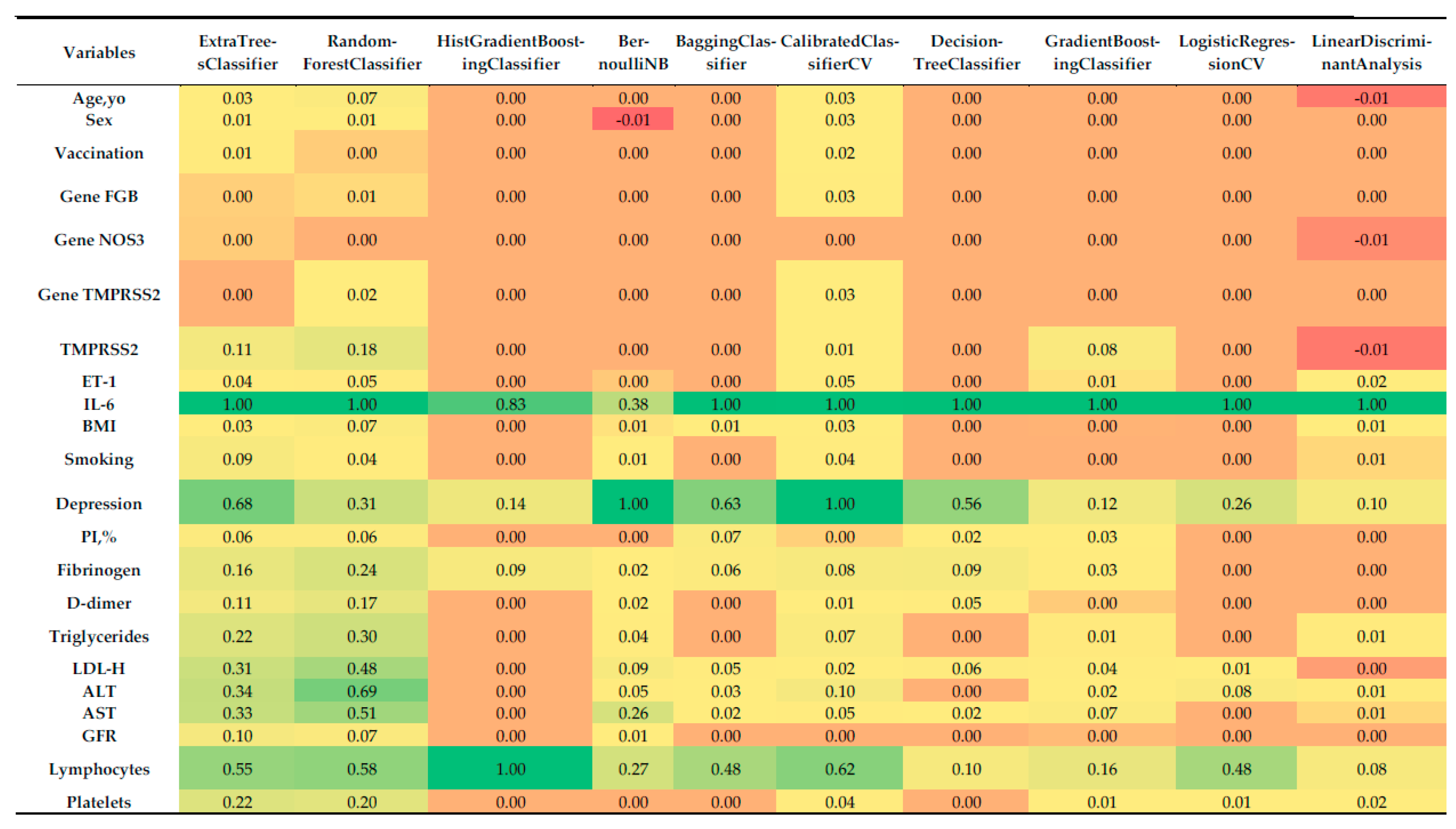 - LogisticRegressionCV and Linear Discriminant Analysis emphasized a narrower set of variables (IL-6, lymphocytes, depression), consistent with their linear structure and more limited capacity to account for complex feature interactions.