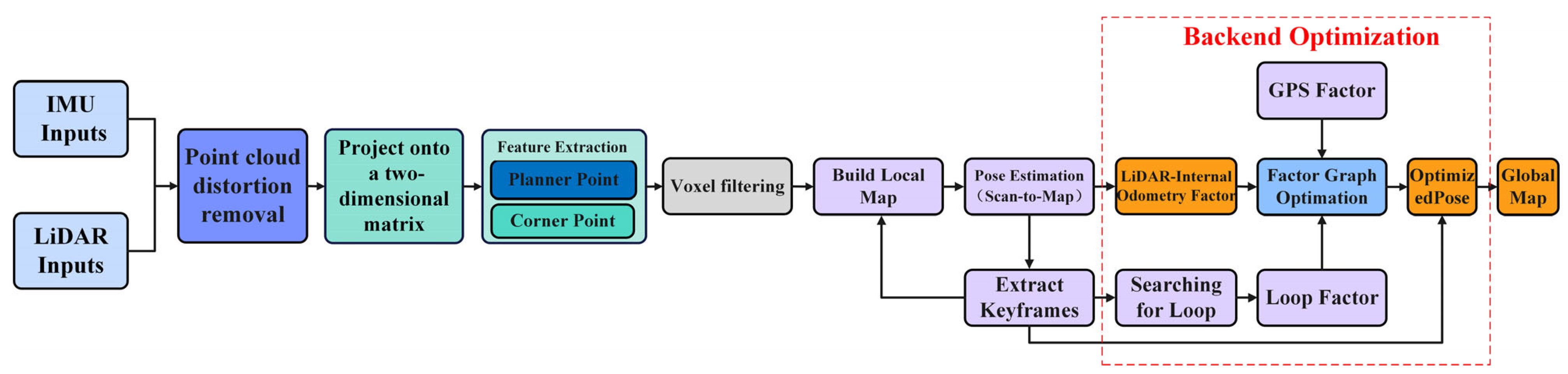 This section presents an efficient and lightweight feature extraction algorithm tailored for LiDAR SLAM systems, aiming to enhance the robustness and computational efficiency of feature selection in complex driving environments. The proposed framework is implemented on top of the open-source LIO-SAM system. The method begins by projecting the raw 3D LiDAR point cloud into a structured 2D range image, significantly improving neighborhood access and reducing spatial redundancy. A novel curvature computation strategy based on 2D image neighborhoods is introduced, along with a multi-criteria feature screening mechanism that incorporates depth continuity, geometric stability, and neighborhood support. To avoid feature clustering and redundancy, a non-maximum suppression scheme is employed, ensuring spatially uniform and independent feature selection. This approach effectively suppresses false detections in occluded regions and enhances geometric consistency in sparse or distorted scans, providing high-quality, sparse, and reliable constraints for back-end pose optimization. The resulting system achieves reduced computational overhead while supporting energy-efficient and high-performance SLAM localization. Some details are in