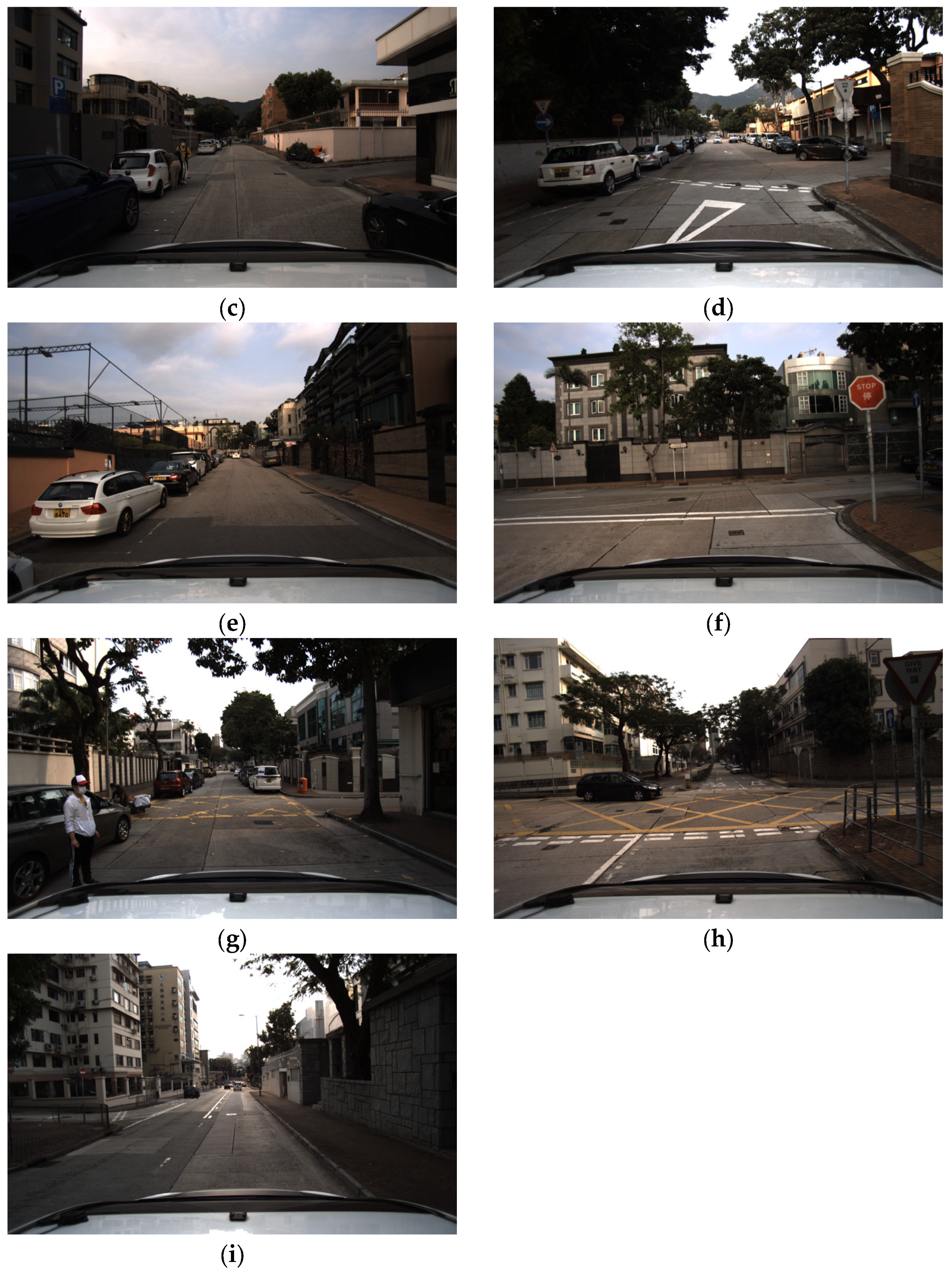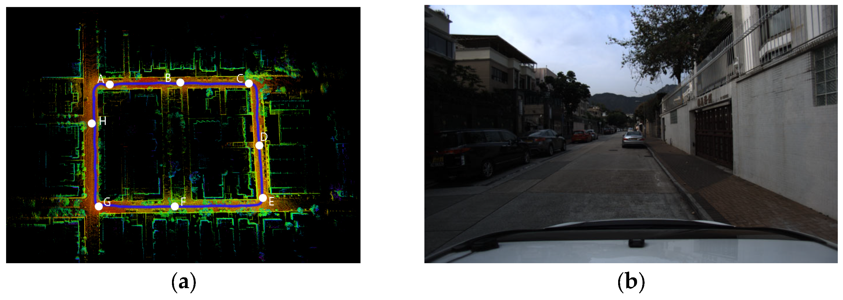 Figure 3b–i present real-world visual observations at each corresponding waypoint (A~H). The images reflect diverse conditions such as changes in road geometry, lighting variations, and the presence of dynamic objects like pedestrians and parked vehicles. Such complexity increases the difficulty of environmental perception and map construction, thereby offering a realistic and challenging benchmark for testing the robustness and adaptability of the Scan-to-Map method under practical urban navigation scenarios.