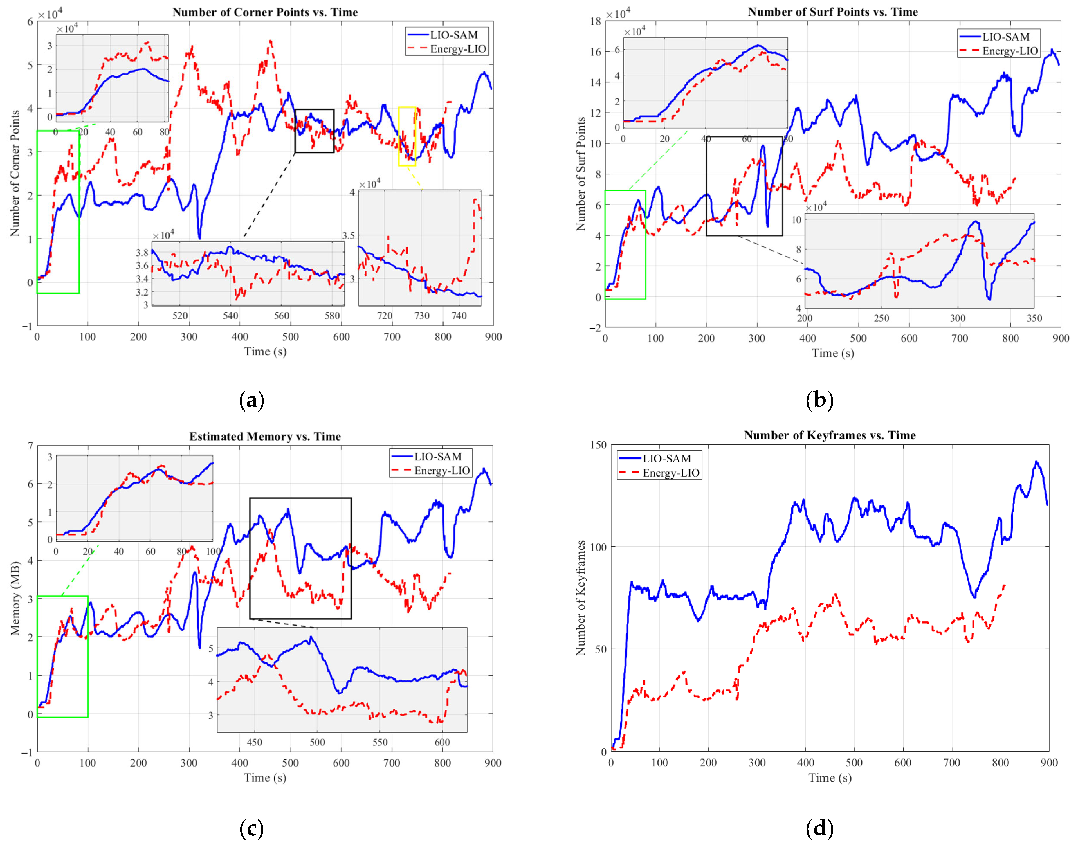 Figure 4b, the number of planar points processed by Energy-LIO remains significantly lower than that of LIO-SAM throughout the entire runtime. Importantly, this reduction is not a simple downsampling of the dataset; instead, it is achieved through intelligent identification and removal of unreliable planar points—often caused by dynamic objects or sensor noise.
