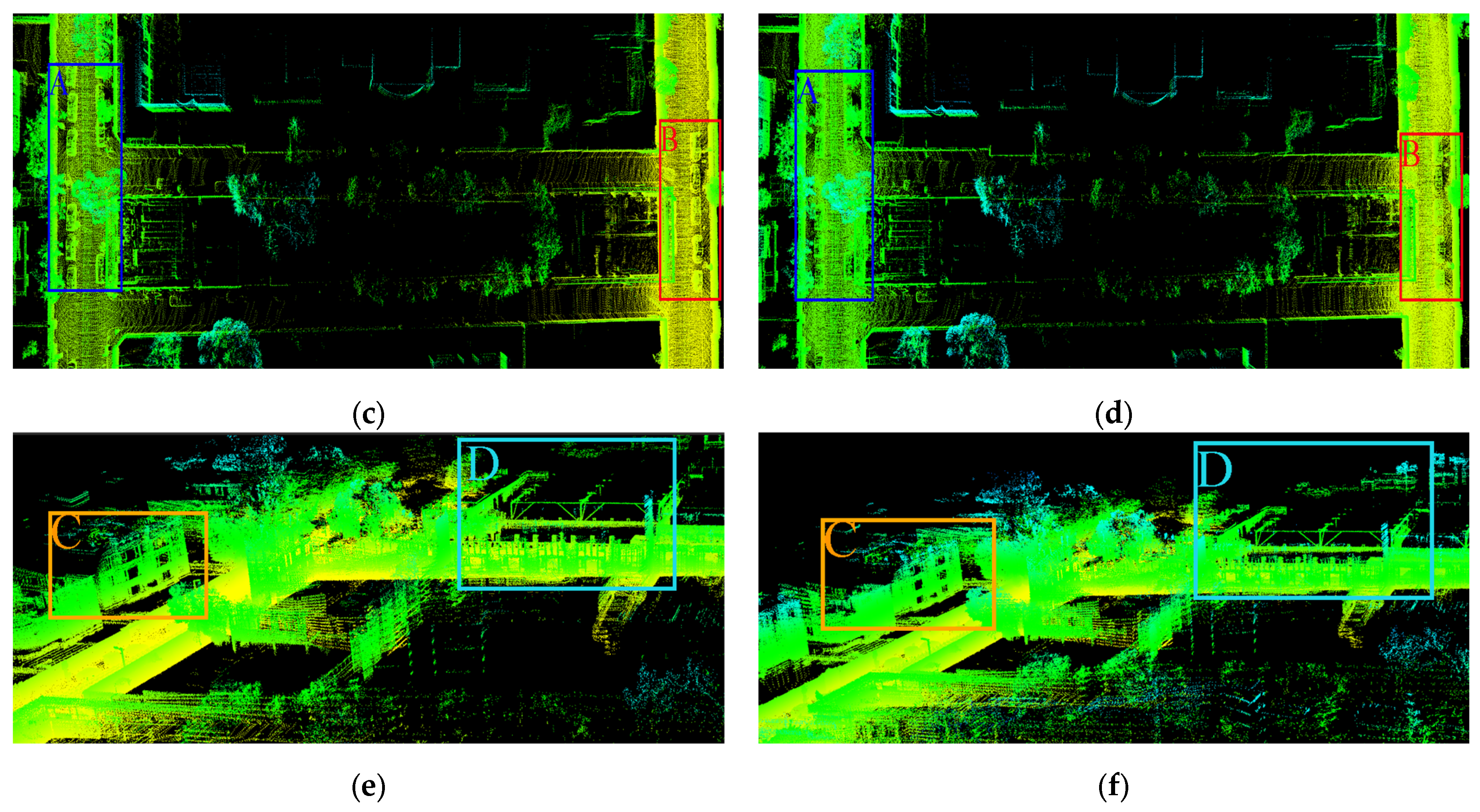 Figure 5b) appears less refined, with structural lines being blurrier and more dispersed. Artifacts such as “ghosting” or “dragging” effects are also observable in certain areas. This high-quality mapping performance is primarily attributed to the denoising and filtering strategies integrated into Energy-LIO. As illustrated in