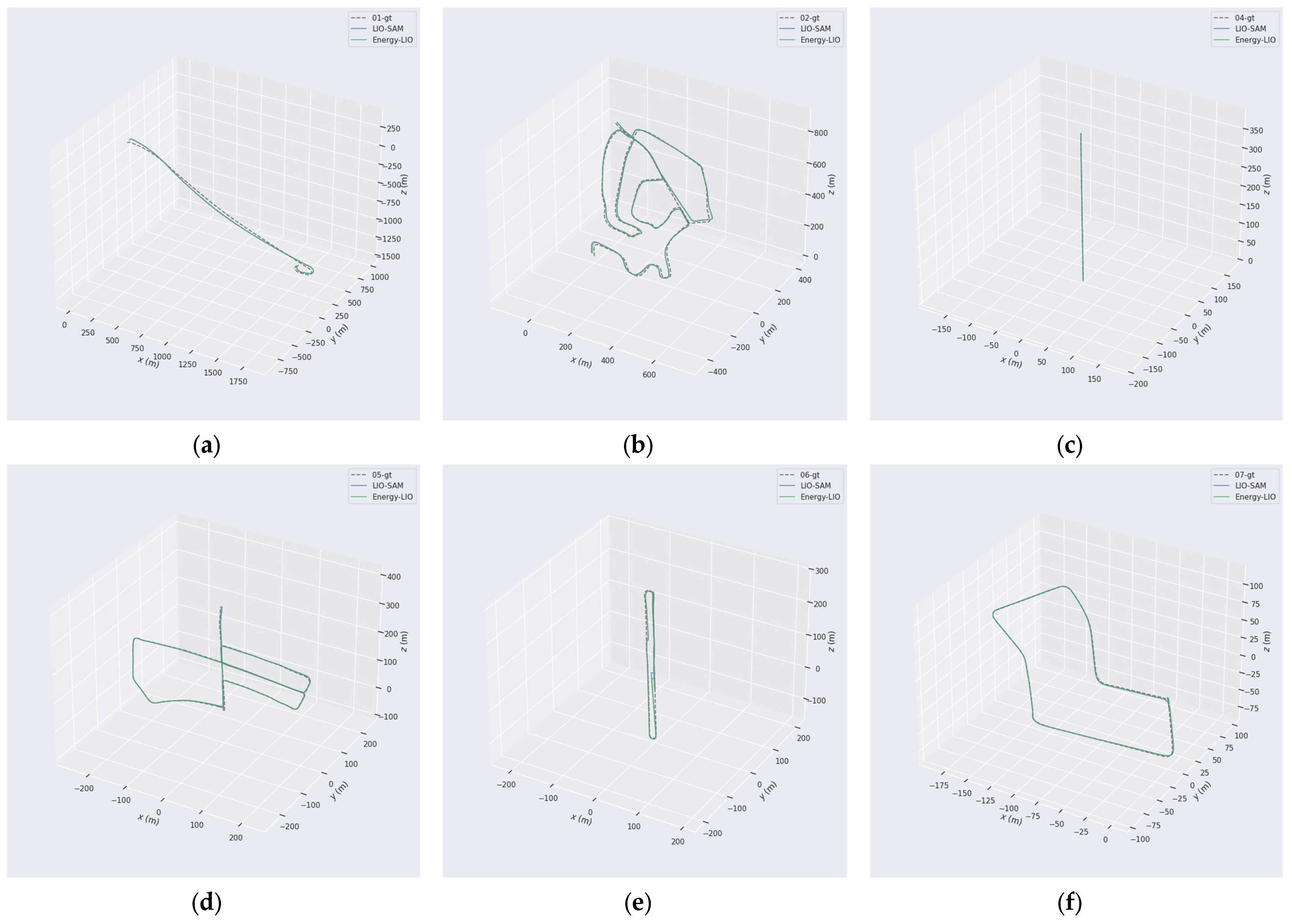 Figure 7c), where the travel distance is limited. In such simple and short trajectories, LIO-SAM exhibited an advantage. Nevertheless, for longer and more complex driving sequences, Energy-LIO consistently demonstrated superior performance.