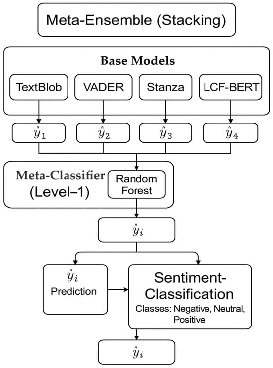 Level 0 (Base Models): includes predictions from the following models: TextBlob: a lexical analyser that returns polarity and subjectivity; VADER: takes into account punctuation marks, emojis, and emotional amplifiers; Stanza: a syntactically informed model from Stanford NLP; LCF-BERT: a contextualised transformer model with local attention. Each base model outputs: —the predicted sentiment (negative, neutral, positive) for review ; —the confidence score of the prediction. Level 1 (Meta-Classifier): the Random Forest algorithm is trained on the outputs of the base models (predictions and confidence levels) and makes the final decision on the tone class.