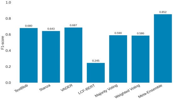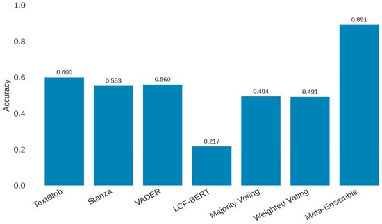 To evaluate the effectiveness of the proposed approach, a comprehensive experiment was conducted on a dataset of tourist reviews of Kazakhstan’s attractions. The objective was to compare the performance of four sentiment analysis models both individually and within several ensemble configurations, including a trainable meta-ensemble (Stacking). The analysis considered key classification metrics—Accuracy, Precision, Recall, and F1-score—and assessed the contribution of each model to the overall performance of the combined method. The results show that the trainable Meta-Ensemble significantly outperforms all other approaches. As demonstrated in Figure 2, in terms of overall classification accuracy, the Meta-Ensemble achieved 0.891, indicating a strong ability to correctly classify all three sentiment classes. VADER and TextBlob reached acceptable values 0.60 but lagged far behind the ensemble, while Majority and Weighted Voting demonstrated less than 0.491–0.494 accuracy, confirming the inefficiency of simple voting schemes. LCF-BERT recorded the lowest accuracy, reflecting its limitations when applied without additional training.