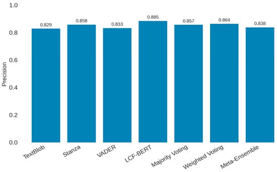 In terms of precision, LCF-BERT achieved the highest score due to its conservative prediction strategy, selecting only classes in which it was most confident. As shown in Figure 3, the Meta-Ensemble maintained a high precision of 0.838 but was slightly lower than the other models because it made more bold predictions, thereby increasing false positives. Stanza, VADER, and TextBlob produced stable precision values of 0.82–0.85, indicating conservative behaviour, while the voting models also achieved relatively high precision but lacked practical usefulness due to their low recall.