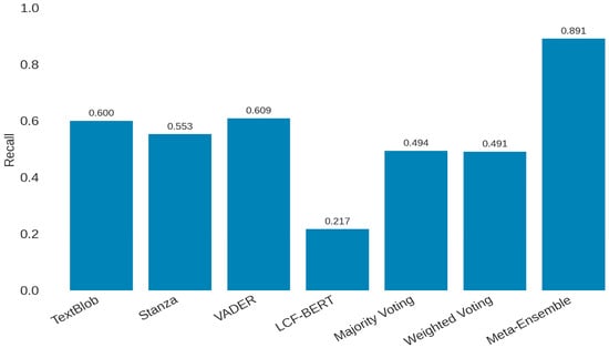 As presented in Figure 4, the recall metric highlighted the Meta-Ensemble’s strength, reaching 0.891, indicating its strong capability to detect almost all relevant cases. In contrast, other models, especially LCF-BERT, failed to identify many true instances (high false negatives). Voting ensembles proved ineffective in extracting diverse sentiment signals from reviews, with a recall of about 0.49.