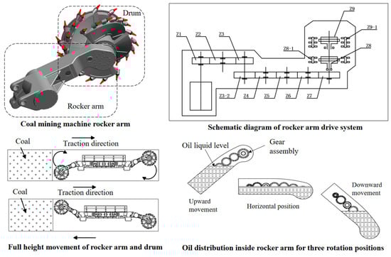 Coal mining equipment reliability is paramount for ensuring operational efficiency and safety in high-yield, fully mechanized longwall faces [,]. As mining heights increase to maximize resource recovery, large-mining-height shearers face intensified mechanical demands, particularly in their rocker arm transmission systems []. The rocker arm—a core component responsible for coal-cutting—critically relies on multi-stage spur and planetary gear systems to transmit high torque to cutting drums under dynamically varying tilt angles []. However, the escalating power density and continuous operation requirements of modern shearers exacerbate thermo-mechanical challenges, leading to premature fatigue failures that compromise productivity and incur significant maintenance costs [].