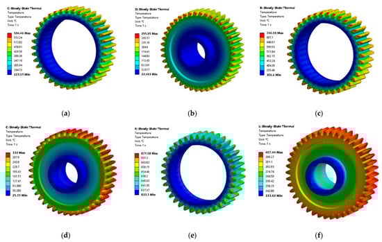 In the Steady-State Thermal module, the working state of gears under oil-free lubrication cooling conditions was simulated. A thorough analysis was performed on the dry friction temperature fields and temperature variation patterns of both gears at different speeds. The temperature distribution analysis under dry friction conditions further reveals the characteristics of gear dry friction. These analysis results provide boundary conditions for subsequent calculations of thermal–fluid–structure coupling fields and life prediction optimization. Figure 3 shows the overall temperature field distribution of gears Z6 and Z7 at different rotational speeds.