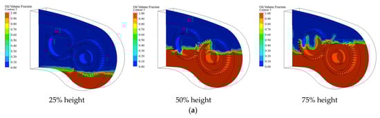 Under the condition that the rotational speed of Z6 gear ranges from 700 to 900 r/min, three different oil immersion depths were additionally set to analyze the temperature field variations of both Z6 and Z7 gears at different speeds. These three oil level heights were set at 25%, 50%, and 75% of the complete immersion depth of Z6/Z7 gears under rocker arm swinging conditions. The current simulation simulated gear rotation through moving walls, thereby calculating the convective heat transfer coefficient to achieve coupling between thermal and flow fields. The temperature field data obtained from the thermal–flow coupling solution were imported into the Static Structural module as boundary conditions for thermal stress analysis, obtaining the thermal stress distribution characteristics of the gear system under lubrication conditions. When the gear speed was 700 r/min, it could be observed that a small amount of lubricating oil was carried to the non-immersed surface through gear rotation, and, as the oil level increased, the gears gradually became immersed in the lubricating oil. The distribution of lubricating oil is shown in Figure 4.