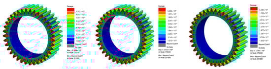 Section 2.3.1 and Section 2.3.2 described the thermal–fluid–structure coupling analysis of the Z6 and Z7 gears under the rocker arm’s ±45 deg operating conditions and during its movement from +45 deg to −45 deg, obtaining the temperature field distributions and thermally induced stress variations of both gears at different rotational speeds and oil immersion depths. These results provide data support for the fatigue life analysis of the two gears in this section. This section will combine the ANSYS nCode fatigue analysis tool to perform fatigue life analysis of both gears after comprehensive consideration of multiple factors.