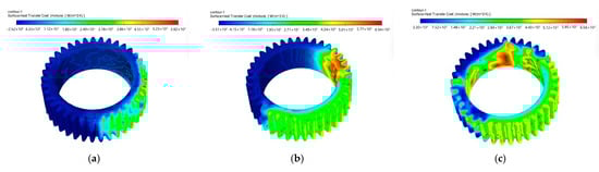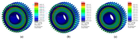 Fatigue damage diagram of Z6/Z7 gears without considering cooling. (a) Z6 700 r/min; (b) Z6 800 r/min; (c) Z6 900 r/min.