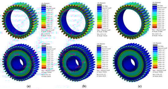 Fatigue life diagram of Z6/Z7 gears without considering cooling. (a) Z6 700 r/min; (b) Z6 800 r/min; (c) Z6 900 r/min.