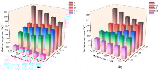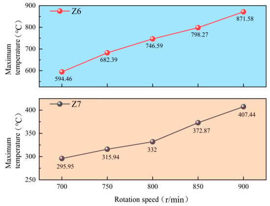 When the speed increases to 800 r/min, the highest temperature points of both gears remain in the meshing region of the gear teeth. The temperature distribution pattern from the addendum circle and the dedendum circle to the inner diameter persists. The Z6 gear’s maximum temperature point remains at the junction of the gear end face, the addendum circle, and the tooth surface, now reaching Tmax = 746 deg. The Z7 gear’s peak temperature occurs at the addendum circle and the tooth surface interface, measuring Tmax = 332 deg. At 900 r/min, the maximum temperature points of both gears continue to be located in the tooth meshing area, maintaining the same radial temperature gradient. The Z6 gear’s peak temperature reaches Tmax = 871 deg at the interface between the gear end face and the tooth surface. Figure 8 shows the maximum temperature variation curves of Z6 and Z7 gears under dry friction conditions at different speeds. The plot clearly demonstrates a linear growth trend in maximum gear temperatures with increasing rotational speed. The Z7 gear consistently maintains lower temperatures than the Z6 gear, attributable to its larger volume, lower rotational speed, and consequently more effective convective heat transfer that facilitates better heat dissipation.