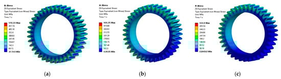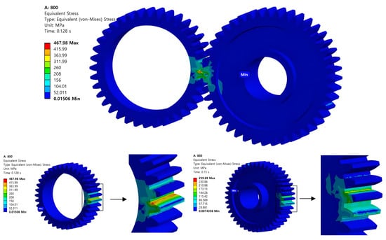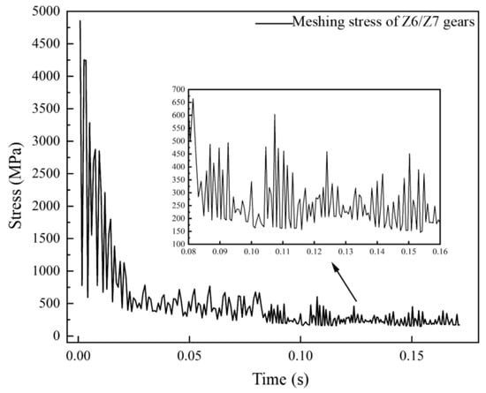 Taking the meshing condition at 800 r/min as an example, Figure 9 shows the stress distribution contour plots of Z6/Z7 gears. The plots clearly demonstrate significant stress concentration in the contact region. However, due to frictional effects, the maximum stress values during meshing do not occur at the contact point but are instead biased toward the dedendum area of each gear. Furthermore, the Z6 gear exhibits higher stress values than the Z7 gear. Figure 10 presents the dry friction meshing stress results at 900 r/min rotational speed. During the simulation process, because the Z6 gear rotates directly at the rated speed while the Z7 gear starts from rest, the transient stresses during initial rotation are extremely high. This calculation covers stress conditions during two complete gear rotation cycles. Data from the first cycle were discarded, with analysis focused primarily on the second cycle’s data.