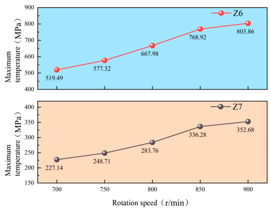 Figure 11 presents the maximum thermo-mechanical stress variation curves of Z6/Z7 gears under dry friction conditions at different rotational speeds, demonstrating a clear positive correlation between rotational speed and thermal stress levels. As the speed progressively increases from 700 r/min to 900 r/min, both gears exhibit significant thermal stress escalation, with the Z6 gear’s maximum thermal stress rising from 519.49 MPa to 803.86 MPa (representing a 54.8% increase), while the Z7 gear’s maximum thermal stress increases from 227.14 MPa to 352.68 MPa (a 55.3% increase), revealing that the Z6 gear consistently sustains approximately 2.3 times higher thermal stress than its Z7 counterpart across all tested speed conditions, with both gears displaying near-linear stress growth patterns that underscore the substantial thermal–mechanical coupling effects under high-speed dry friction operation.