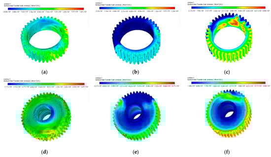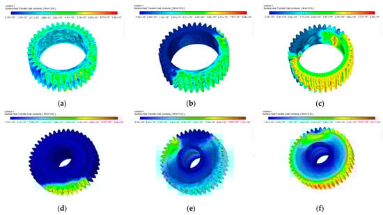 Convection heat transfer coefficient of Z6/Z7 gears at 800 r/min. (a) Z6 25% height; (b) Z6 50% height; (c) Z6 75% height; (d) Z7 25% height; (e) Z7 50% height; (f) Z7 75% height.