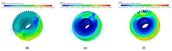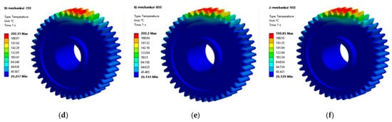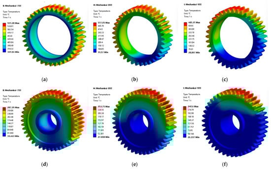 Thermal stress distribution of two gears at 25% oil immersion depth at different speeds. (a) Z6 700 r/min; (b) Z6 800 r/min; (c) Z6 900 r/min; (d) Z7 700 r/min; (e) Z7 800 r/min; (f) Z7 900 r/min.