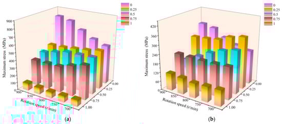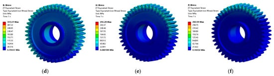 Figure 19 illustrates the thermal stress variation of the Z6/Z7 gear pair under different rotational speeds and oil immersion depths. As shown in the figure, the trend of thermal stress aligns closely with the temperature changes described earlier. Under constant speed conditions, when the rotational speed of gear Z7 is below 800 r/min, its thermal stress initially increases and then decreases with increasing oil immersion depth. However, when the speed exceeds 800 r/min, the thermal stress first decreases, then increases, and finally decreases again as the immersion depth rises. This complex stress behavior can be attributed to the coupled effects of multiple factors. In the lower speed range, as the oil immersion depth increases, the cooling effect of the lubricating oil film gradually strengthens. At the same time, intensified oil agitation inside of the gearbox leads to localized stress concentrations. In the higher speed range, in addition to the thermal–fluid–structure interaction effects, additional stresses arise from the dynamic pressure effects of the oil film.