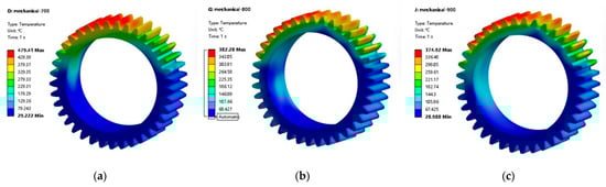 The cooling effectiveness varies significantly with oil immersion depth, directly influencing temperature and thermal stress distributions. At 25% immersion depth, where Z6 remains unsubmerged while Z7 is partially immersed, Figure 15 demonstrates how rotational speed affects thermal performance; at 700 r/min, uniform temperature distribution on Z6 (Tmax = 551 deg) contrasts with Z7’s cooler immersed portions (Tmax = 287 deg), both peaking at meshing zones. Increasing the speed to 800 r/min expands cooled regions, lowering peak temperatures. The 900 r/min condition shows continued but decelerating cooling, revealing a nonlinear speed–temperature relationship. Corresponding thermal stress distributions (see Figure 16) exhibit complex interdependencies among speed, temperature, and immersion conditions, with stress concentrations consistently located in meshing areas despite varying cooling patterns.