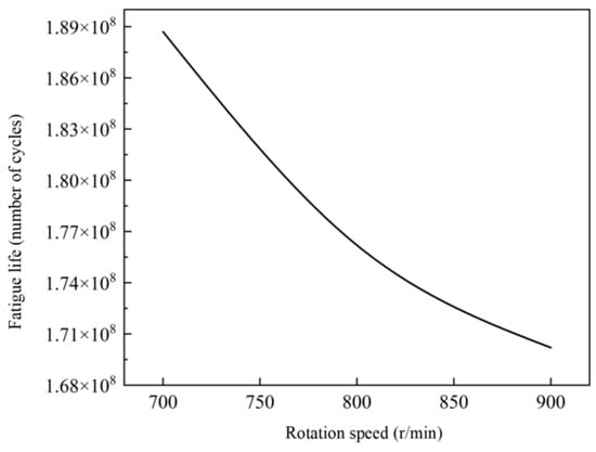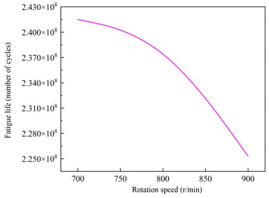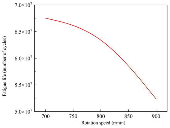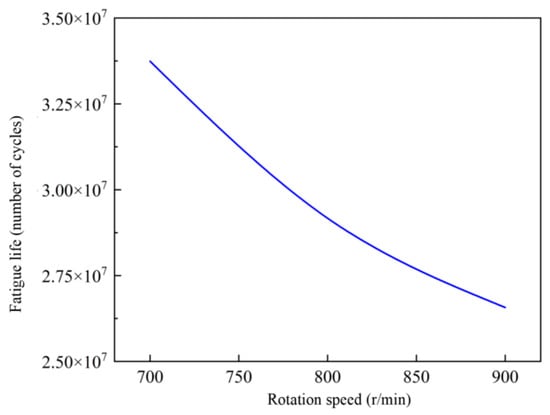 The simulated life data without considering cooling were compiled and summarized, with the results shown in Figure 20 and Figure 21. From the figures, it can be observed that in the absence of external cooling, the rotational speed and gear fatigue life exhibit a negative correlation. As the speed increases, the fatigue life of the gears decreases. The fatigue life of the Z6 gear follows a concave downward trend; while higher speeds reduce fatigue life, the diminishing effect gradually weakens. This is because at higher speeds, the influence of temperature on gear life becomes more pronounced, thereby mitigating the impact of stress on fatigue life. In contrast, the fatigue life of the Z7 gear exhibits a concave downward trend, where increasing speed not only reduces fatigue life but also intensifies the effect. This occurs because higher speeds lead to more frequent and complex load fluctuations during drum coal cutting, accelerating gear wear. In this simulation, one cycle was defined as a single rotation of the Z6 gear. Assuming the coal shearer operates 18 h per day, the predicted service life of the Z6 and Z7 gears under uncooled conditions was converted, as detailed in Table 4.