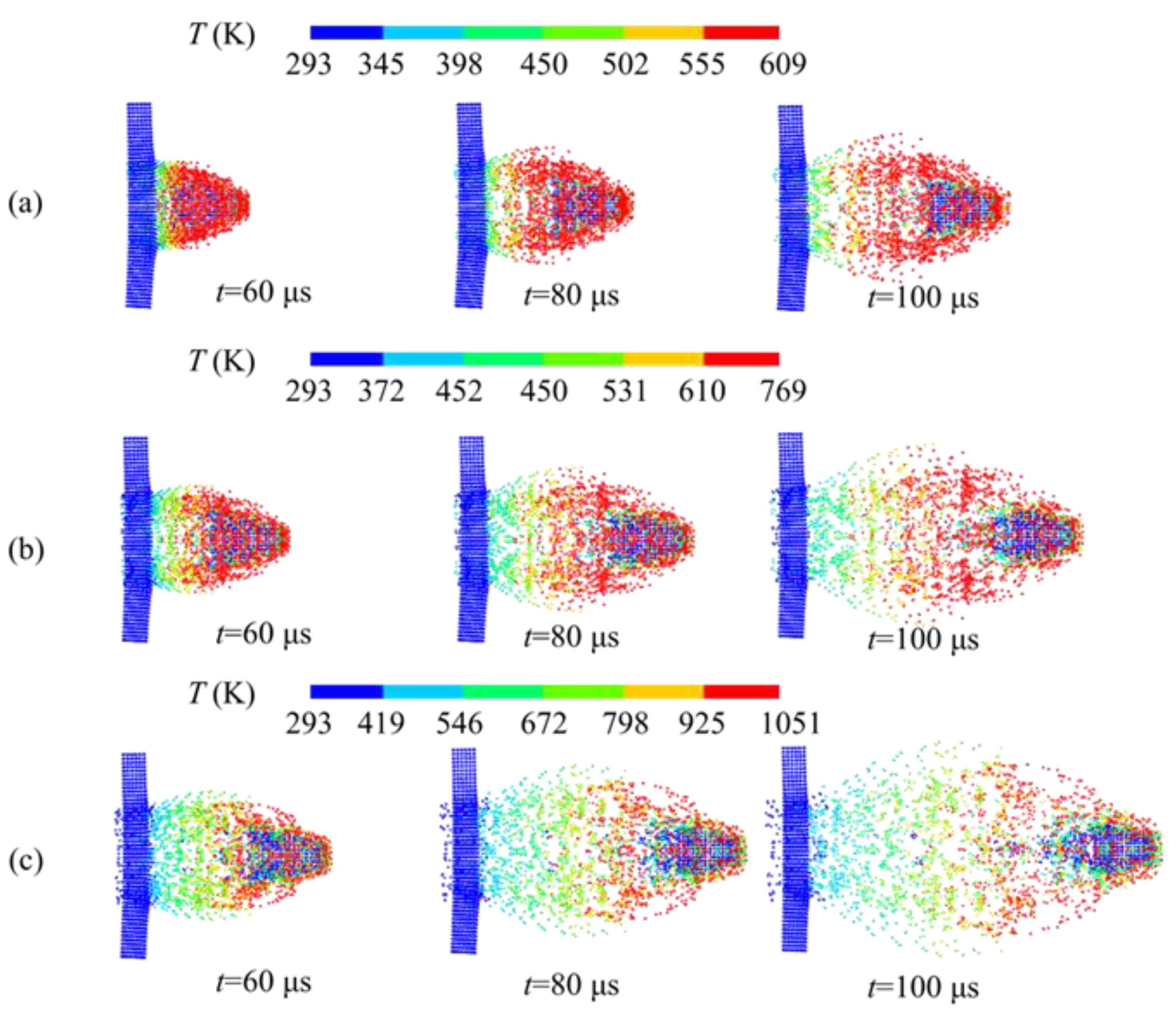 - The impact velocity significantly influenced the temperature of the debris cloud. The fragment dispersion effect strengthened and the temperature increased with the impact velocities of the projectile. The temperature of the debris cloud increased by 150–200 K when the impact velocity increased by 200 m/s.
